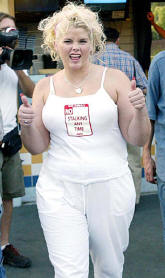 Weeee doggies. I'd rather be fat and, well, not stupid. Referring to her behavior at that event, she later wrote it off to an addiction to prescription drugs in an interview with "The Early Show," saying, "I actually went into a coma, you know. I almost died. And I had to learn how to walk again and all this and that." Witnesses said she had about 20 too many before getting on the stage (too many what was not mentioned). One could say it was quite a clever move because you'd better believe that Usher and Outkast were the only ones who were talking about their sweeping wins the next day. Everyone else was talking about freaky Anna Nicole. She also got her "Like my bawwwddddy?" catch phrase from that appearance that went on to be used in her TrimSpa commercials. Jimmy Kimmel's comment was, "I told her to stay away from Snoop's brownies." If it was a conquered addiction as she stated, she should fire her physical therapist because it didn't look like she was doing too good of a job walking in April 2005 at the Australian MTV Awards when out of the blue, she whipped off her shirt to review a good sized "MTV" logo on each good sized boob: